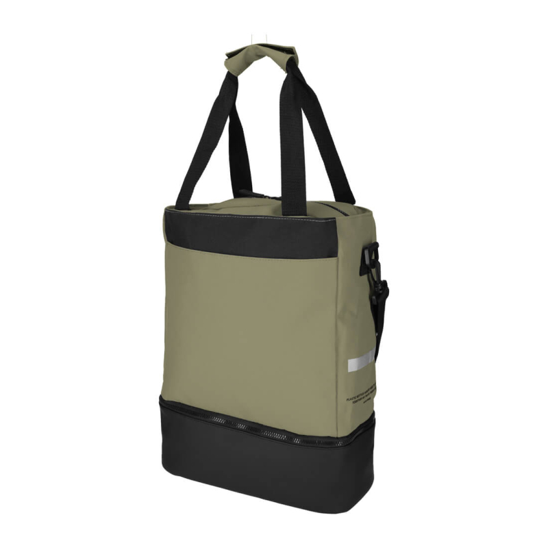Deze ruime all-in-one shopper is gemaakt van gerecycled polyester, wat deze tas een duurzaam karakter geeft. In deze tas zijn maar liefst 10 PET flessen verwerkt. Het ritsvak van vegan leer geeft de tas een stoere touch. Deze tas is uitgerust met een groot hoofdvak en een ritscompartiment onderin dat door het isolatiemateriaal geschikt is om eten en drinken koel te houden. Daarnaast is de tas uitgerust met reflecterende strepen voor extra zichtbaarheid in het donker. De shopper is makkelijk mee te nemen aan de handvatten of schouderband en kan bevestigd worden aan een fietsendrager door middel van de fietshaken aan de achterzijde.