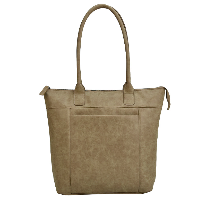Deze Vintage PU shopper in de kleur taupe is een luxe tas voor de dames. Voorzien van een ritssluiting, binnenvak met rits en een laptopvak met klittenbandsluiting. Aan de buitenzijde een voorvak met rits en twee handvatten.
