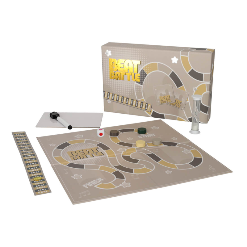 Bij het bordspel Beat Battle draait alles om muzikale kennis en teamwork! Wanneer het jouw beurt is gooi je de dobbelsteen en pak je een kaart. Voer de opdracht uit bij de desbetreffende kleur van de dobbelsteen. Er zijn 5 verschillende categorieën; vraag en antwoord, neuriën, gebaren, tekenen en verboden woord. Voor het uitvoeren van deze opdracht heb je 60 seconde de tijd. Heb je de titel en artiest juist geraden? Gefeliciteerd, je mag een stapje vooruit! Daarna mag je ook nog het jaartal raden om extra voordelen te verdienen. Dit spel is perfect voor muziekliefhebbers en zorgt voor een avond vol plezier, competitie en herkenbare melodieën!