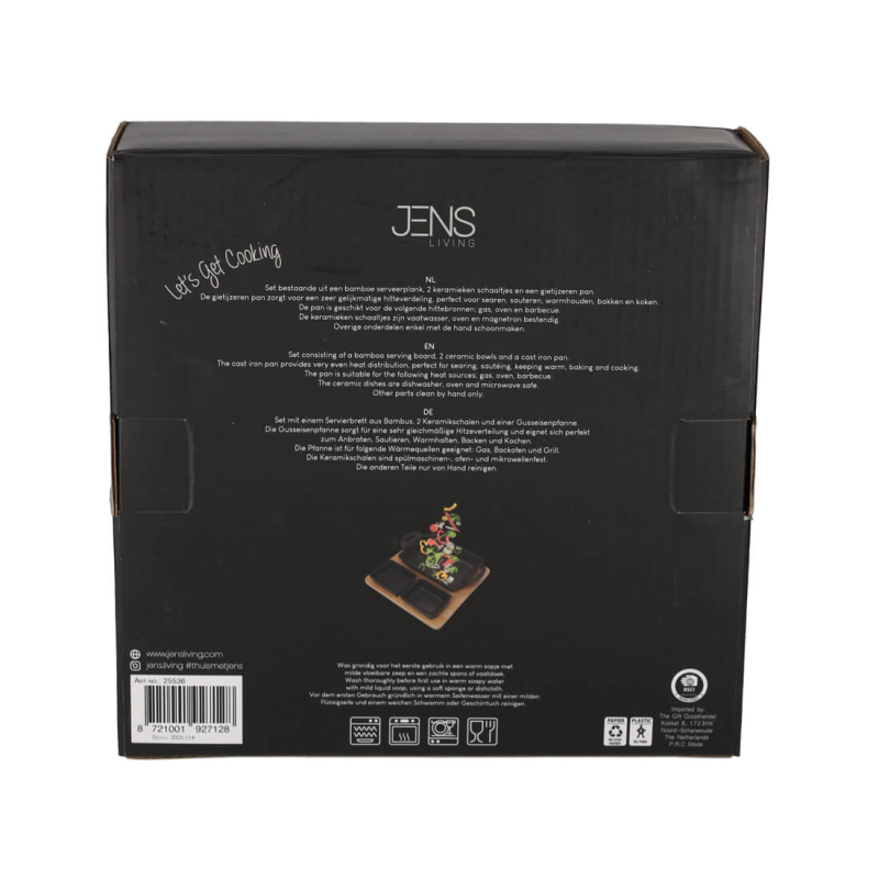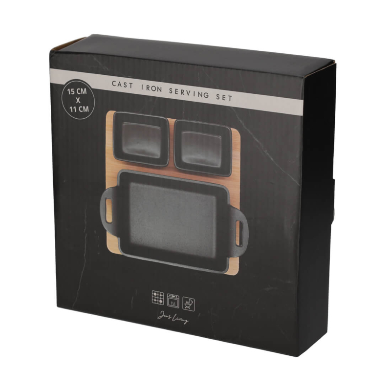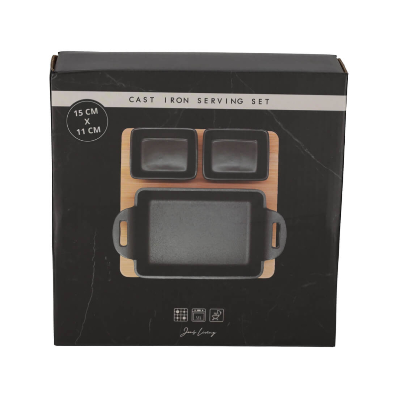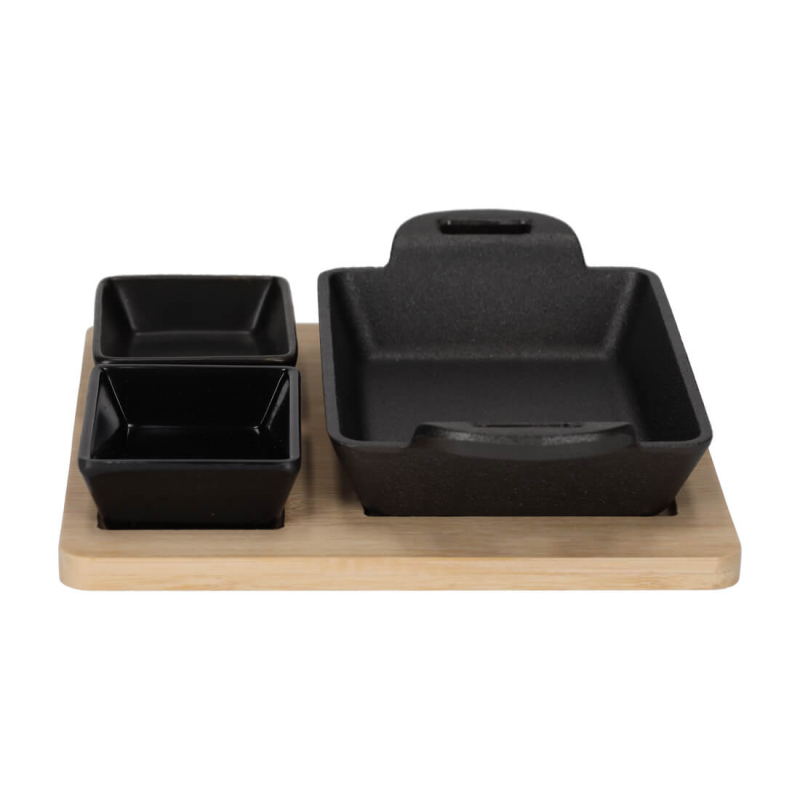 Presenteer je gerechten of hapjes op een bijzondere manier met deze stijlvolle serveerset. De set bestaat uit een bamboe houten plank, twee keramische bakjes en een gietijzeren schaal. Perfect voor het serveren van bijvoorbeeld nacho's met guacamole en salsa dip. Deze set voegt een sfeervolle en functionele touch toe aan je tafel, ideaal voor zowel informele borrels als gezellige etentjes.