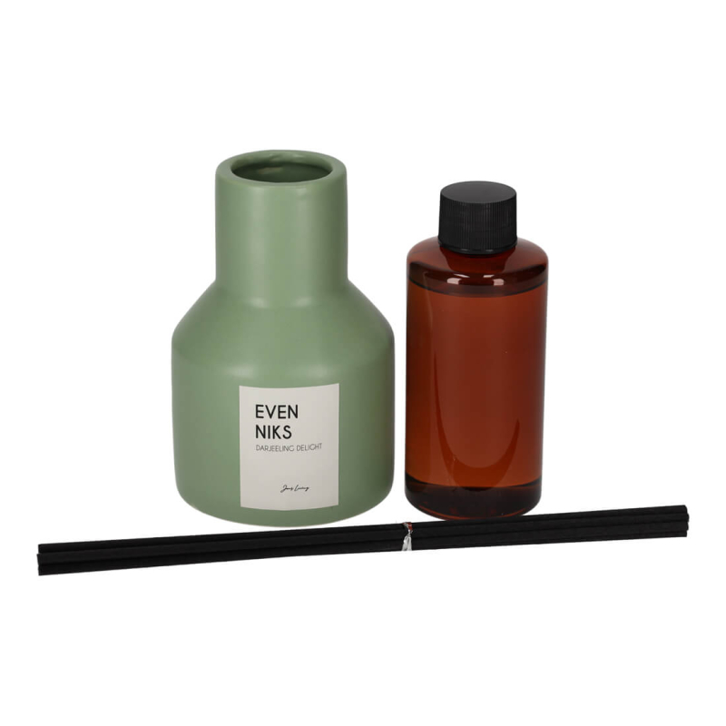 Breng een fijne sfeer in huis met deze luxe geurstokjes. De fruitige darjeeling geur is perfect is voor elke gelegenheid. Met de quote 'Even niks' brengt de diffuser een speelse touch in je interieur. Wil je de geurintensiteit versterken? Draai de stokjes eenvoudig om voor een extra boost.