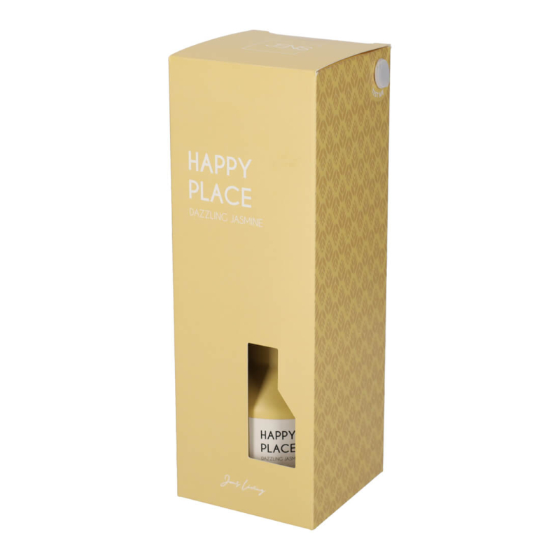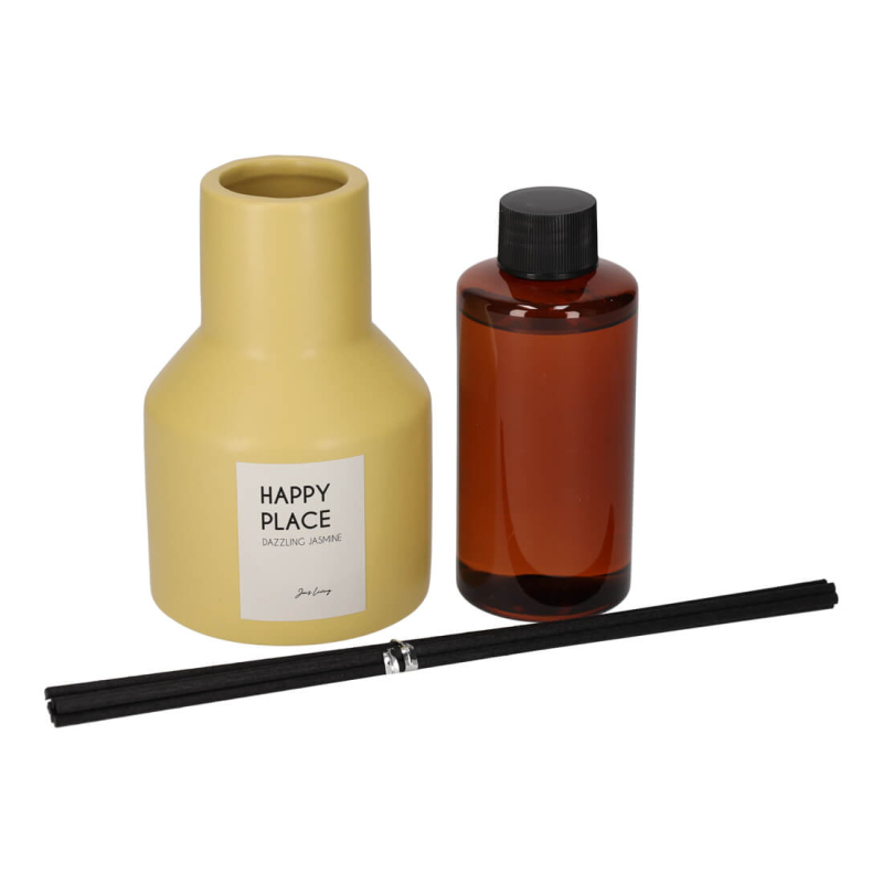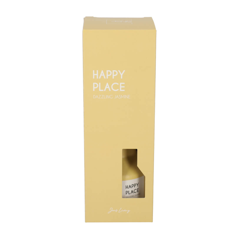Breng een fijne sfeer in huis met deze luxe geurstokjes. De bloemige jasmijngeur is perfect is voor elke gelegenheid. Met de quote 'Happy place' brengt de diffuser een speelse touch in je interieur. Wil je de geurintensiteit versterken? Draai de stokjes eenvoudig om voor een extra boost.