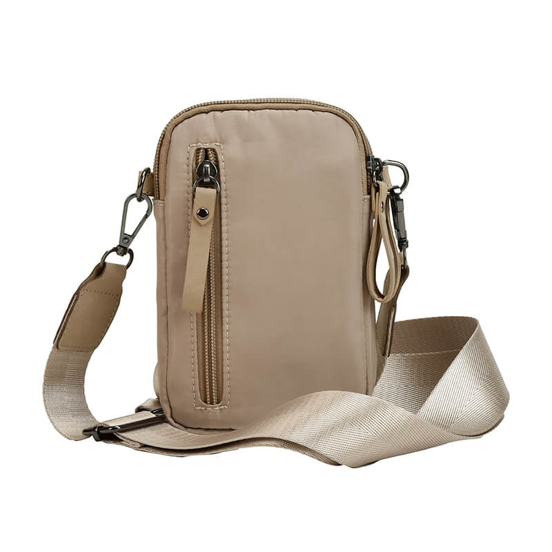 Een telefoontasje van padded materiaal in een warme taupe kleur. Het telefoontasje is voorzien van 2 vakken met rits, voorvak met een drukknop en achtervak met rits en schouderband.