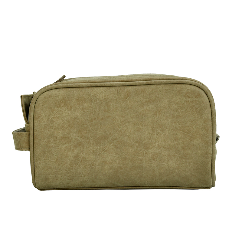 Vintage PU collectie taupe toilettas. De bovenzijde van de toilettas heeft twee ritssluitingen en een klittenbandsluiting. Verder is de toilettas voorzien van een binnenvak met rits, een ophanglus en een band voor op de trolley.