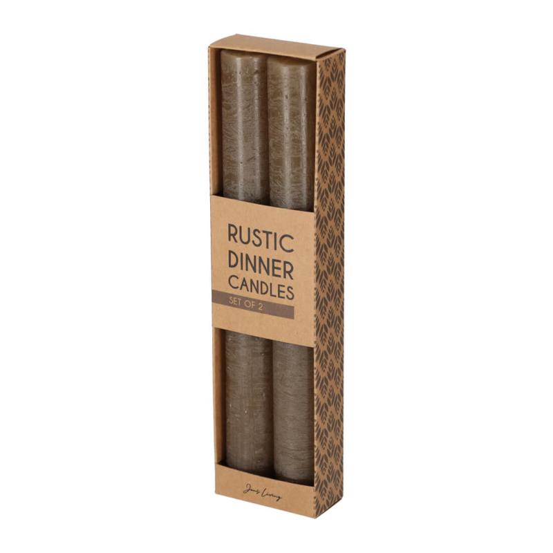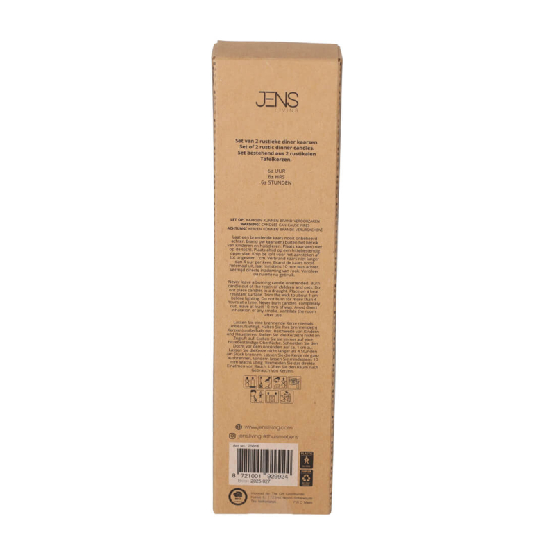 Breng licht, warmte en sfeer in huis met deze rustieke dinerkaarsen. Deze set bevat twee kaarsen van 20 cm, die ongeveer 6 uur branden. De kaarsen zijn ideaal te combineren met een JENS Living kandelaar.