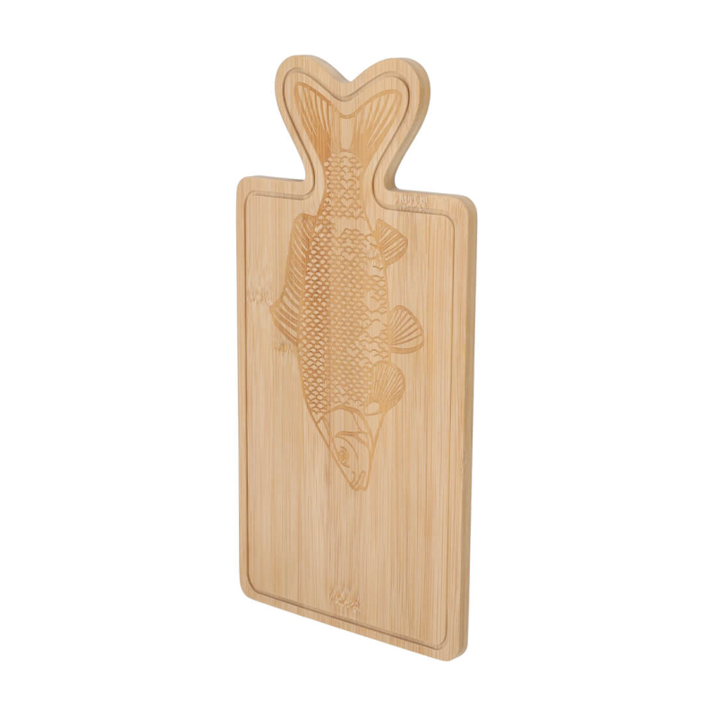 Deze bamboe serveerplank is de ideale manier om je hapjes of kaasplank op een stijlvolle manier te presenteren. De gravering van de vis voegt een unieke touch toe waardoor de plank ook als decoratief item een mooie toevoeging is aan je keuken.