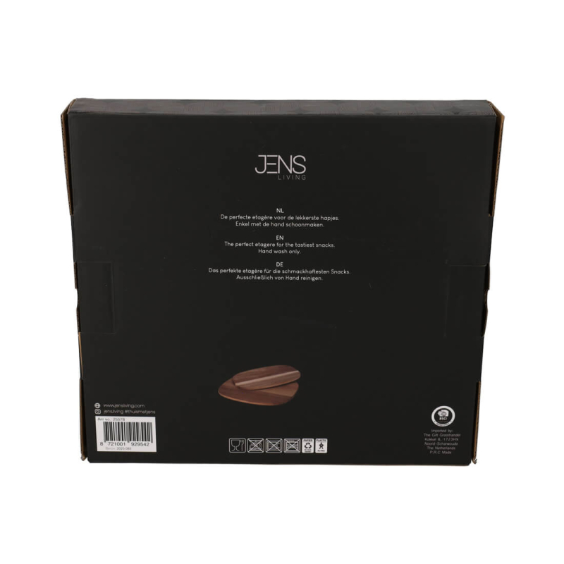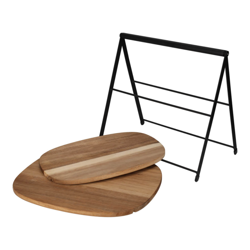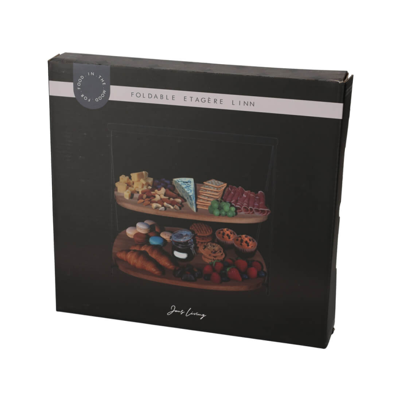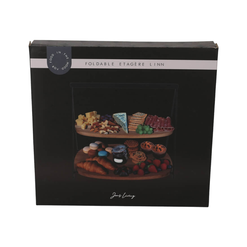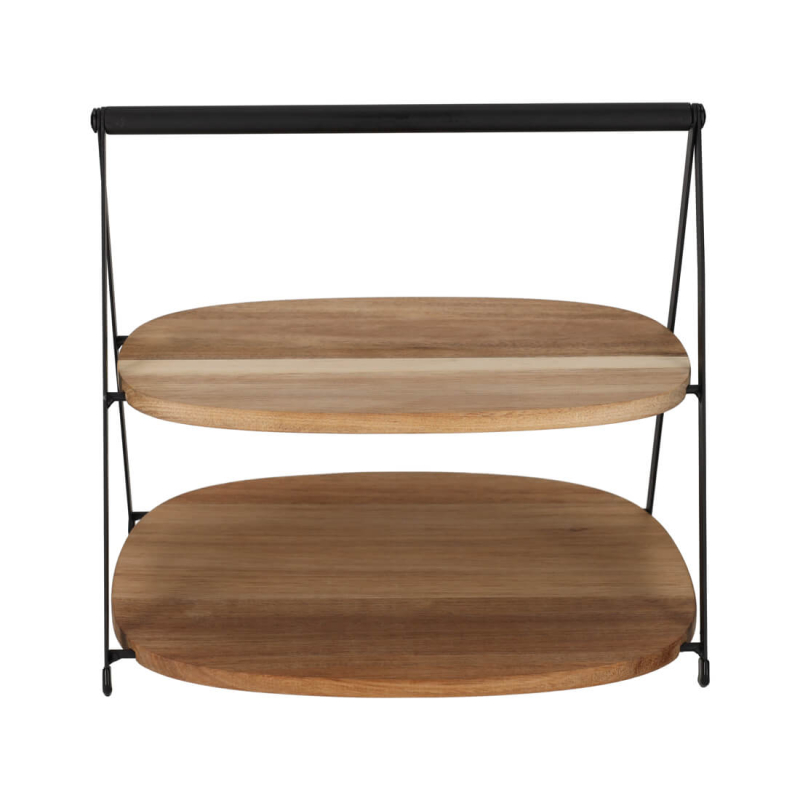 Deze etagère heeft twee ovale etages van acaciahout, verbonden door een metalen tussenstang met een handvat aan de bovenzijde. De etagère is opvouwbaar en daardoor eenvoudig op te bergen. Gebruik hem voor het serveren van borrelhapjes of als stijlvolle accessoire in je interieur. De planken zijn daarnaast ook los te gebruiken.