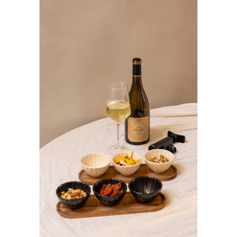 Deze leuke serveerset is ideaal voor het serveren van snacks, dips of zoete lekkernijen. De set bestaat uit een acaciahouten plankje met drie keramieken schaaltjes in de vorm van een schelp, wat het een unieke en speelse uitstraling geeft. Een stijlvolle manier om je hapjes te presenteren!