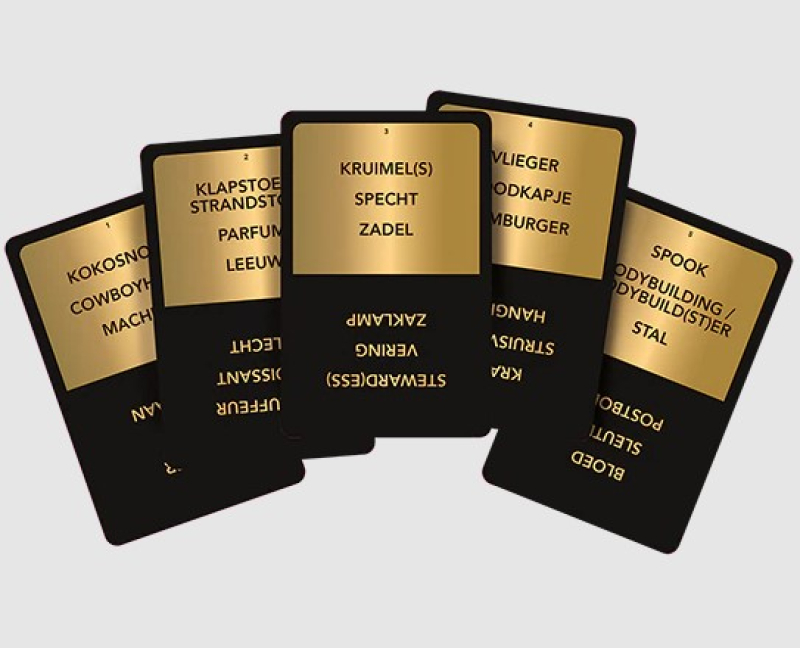 In dit hilarische partyspel strijden 2-4 teams van 2-3 spelers tegen elkaar. Als 'hint-gevende-speler' heb je 30 seconden om je team de 3 opgaven van een kaart te laten raden. Maar... 1 opgave moet je omschrijven met woorden, 1 moet je tekenen en 1 moet je uitbeelden! Welke opgave je hoe doet, bepaal jij. Net zoals de volgorde. Dus denk goed na, maar niet te lang want anders sta je opeens een 'kokosnoot' uit te beelden... Onder de tijdsdruk ga je de vreemdste dingen doen. Dat wordt lachen. Veel speelplezier!