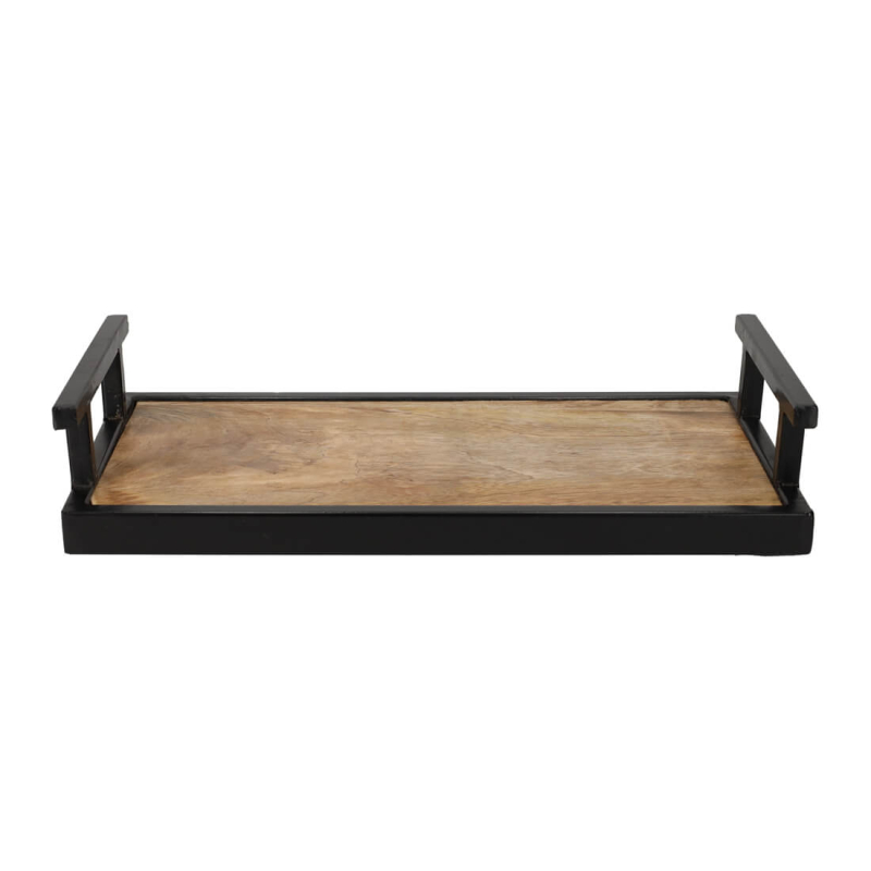 Dit houten dienblad voegt een industriële touch toe aan je interieur. De combinatie van het warme hout en de robuuste metalen details creëert een harmonieuze mix van natuurlijke charme en modern design. Perfect om je favoriete decoraties, zoals kaarsen of planten, op te presenteren!