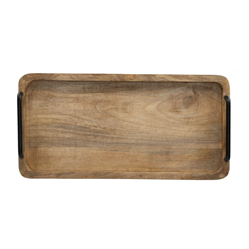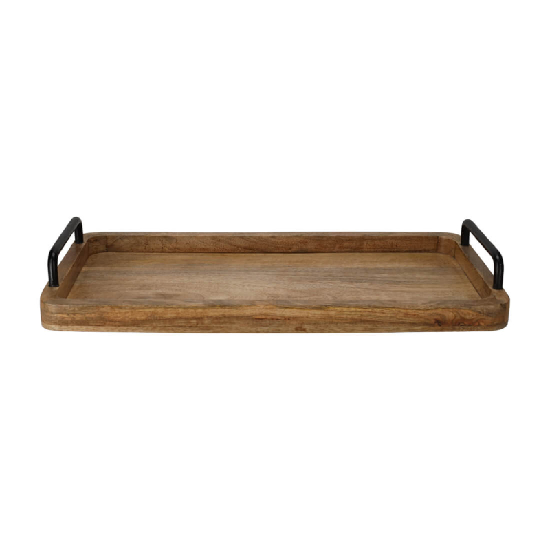 Dit houten dienblad met stoere ijzeren handvatten is de perfecte basis voor stijlvolle decoraties in het interieur. Het warme hout en de industriële accenten vormen een prachtige combinatie. Met dit dienblad creëer je de mooiste creaties met kaarsen, planten of andere accessoires.