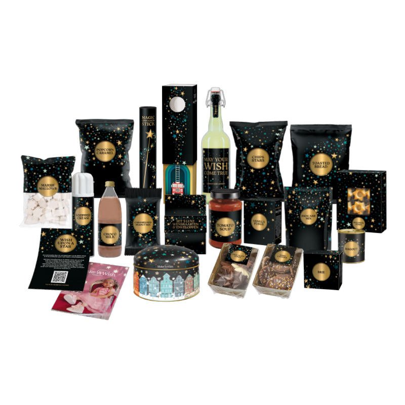 Kerstpakket Wish Upon a Star; met deze lijn steun je Stichting Make-A-Wish Nederland en help je de liefste wens van een ziek kind te vervullen.