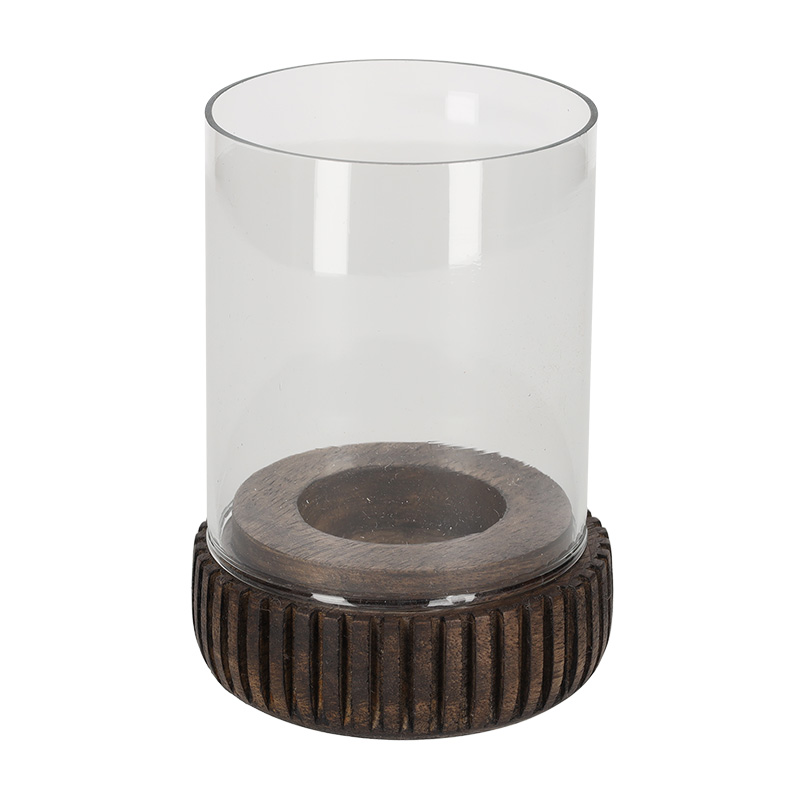 Deze theelichthouder combineert natuurlijk mangohout met glas voor een warme, stijlvolle uitstraling. Het geribbelde houten onderstel geeft het ontwerp een subtiel speels accent en zorgt voor een stevige basis.