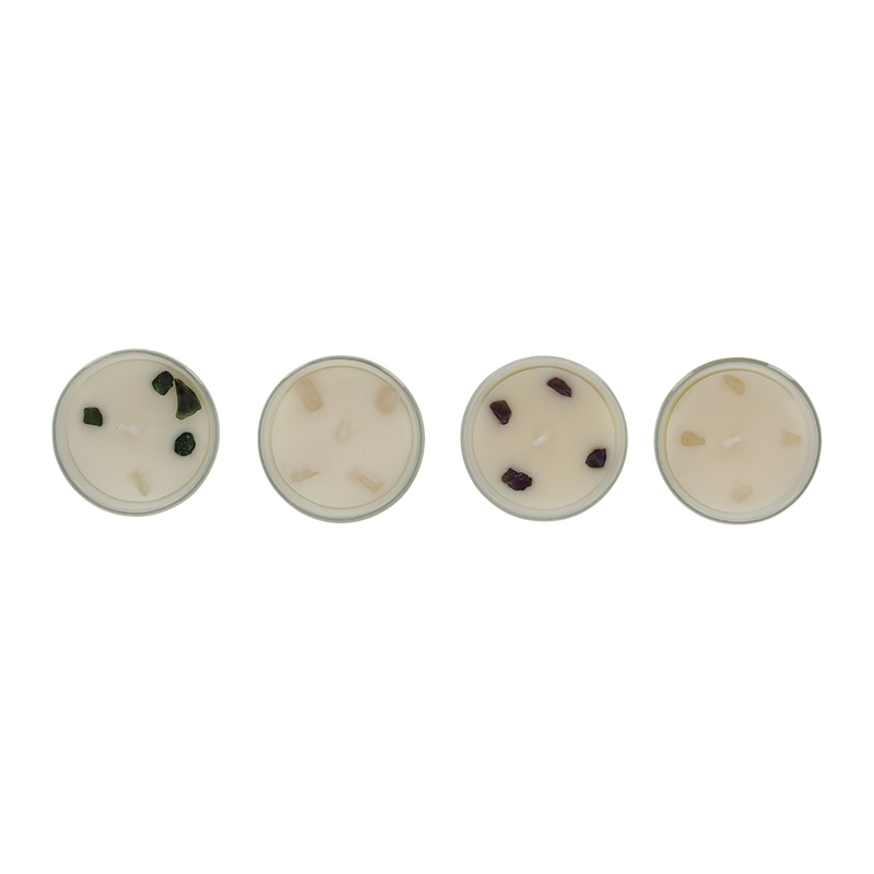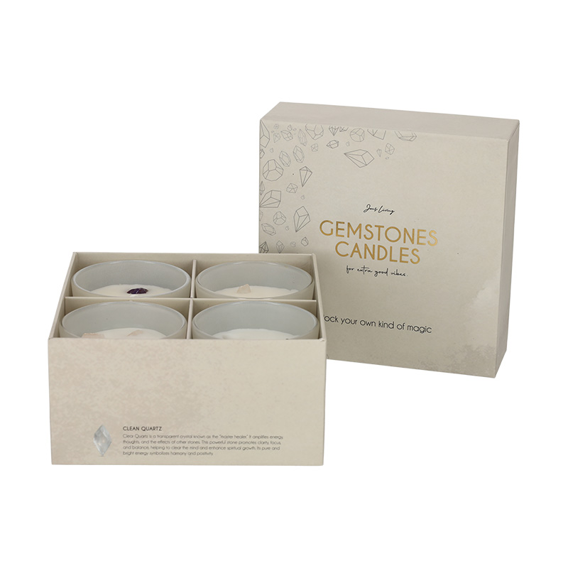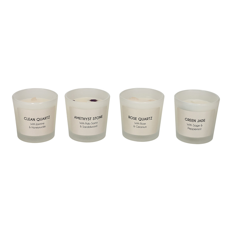 Deze luxe geurkaarsen set bestaat uit vier kaarsen, met ieder een eigen geur en edelsteen. De kaars met Amethist heeft een geur van Palo santo en sandalwood. De kaars met Kwarts heeft een geur van jasmijn en kamperfoelie. De kaars met rozenkwarts heeft een geur van rozen en geranium. De kaars met Groene Jade heeft een geur van salie en pepermunt. De edelstenen hebben alle vier een eigen kracht die uitgebreid wordt uitgelegd op de verpakking. Elke kaars brandt ca. 10 uur.