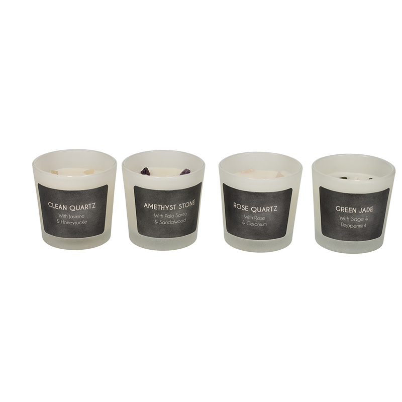 Deze luxe geurkaarsen set bestaat uit vier kaarsen, met ieder een eigen geur en edelsteen. De kaars met Amethist heeft een geur van Palo santo en sandalwood. De kaars met Kwarts heeft een geur van jasmijn en kamperfoelie. De kaars met rozenkwarts heeft een geur van rozen en geranium. De kaars met Groene Jade heeft een geur van salie en pepermunt. De edelstenen hebben alle vier een eigen kracht die uitgebreid wordt uitgelegd op de verpakking. Elke kaars brandt ca. 10 uur.