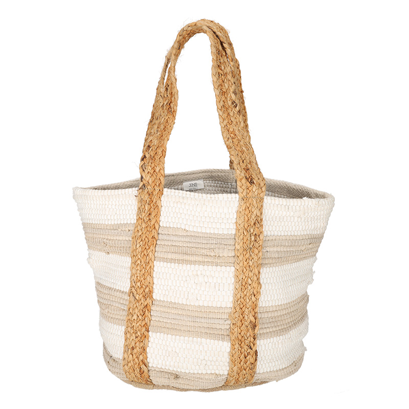 Deze ruime tas is perfect voor boodschappen, stranddagen of als stijlvolle opberger in huis. De tas is gemaakt van 70% gerecycled katoen en 30% jute, wat zorgt voor een stevige en rustieke uitstraling. De combinatie van verschillende tinten en de natuurlijke jutehandvatten geven de tas een warme, authentieke look. Een praktische én duurzame tas voor dagelijks gebruik.