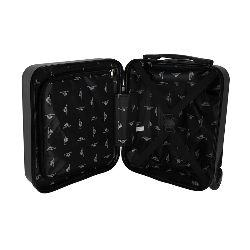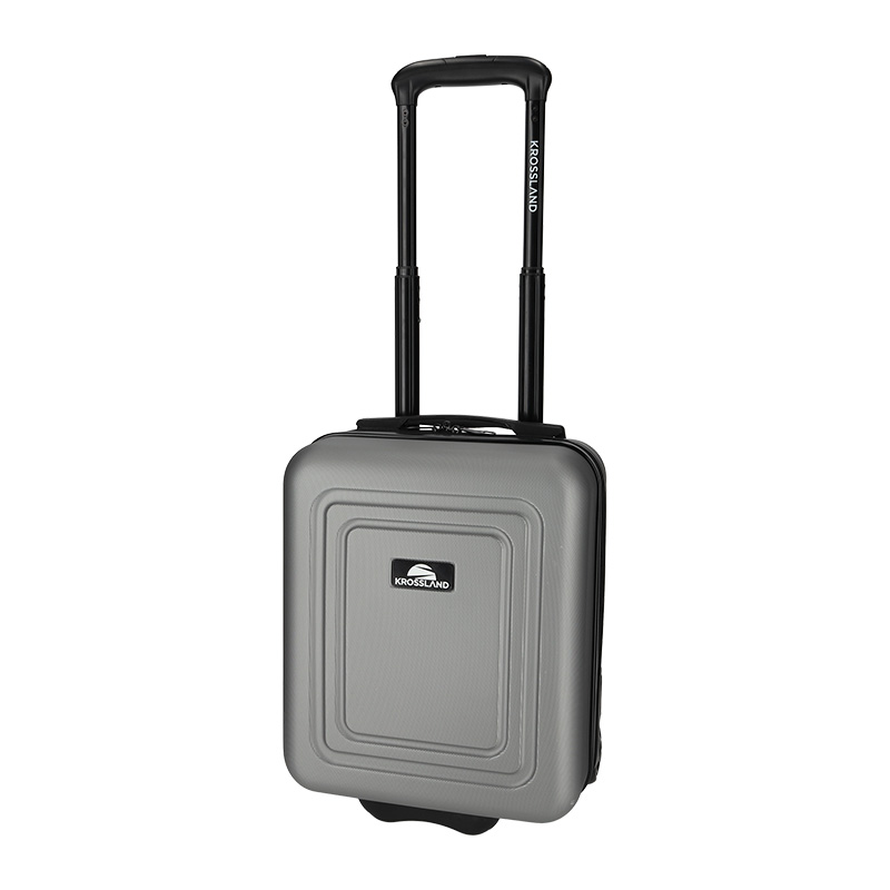 Deze compacte KROSSLAND trolley is speciaal gemaakt om onder de stoel in het vliegtuig te passen. Hierdoor mag de trolley mee in het vliegtuig en hoef je na de landing niet te wachten op bagage. De trolley heeft een uitschuifbare stang en twee luxe soft wieltjes. De binnenzijde bestaat uit een hoofdcompartiment met buckles en een ritsvak. Aan de voorzijde zit een metalen badge van 58 x 25 mm. Hier kan eenvoudig een doming sticker overheen worden geplakt.