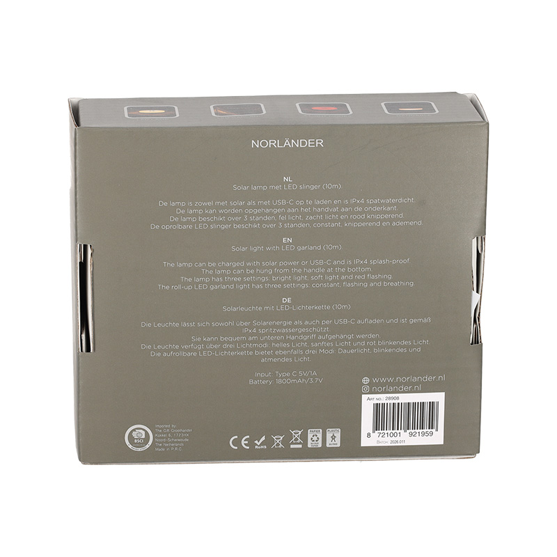 Deze sfeervolle lamp wordt geleverd met een oprolbare LED-slinger. Dankzij het handvat aan de onderzijde kan de lamp eenvoudig worden opgehangen. De lamp heeft drie lichtstanden: fel, zacht en rood. De LED-slinger biedt extra variatie met constant, knipperend en ademend licht. Opladen kan zowel via zonlicht als met USB-C. Dit artikel heeft een IPx4 keurmerk. Dit betekent dat lamp spatwaterbestendig is.