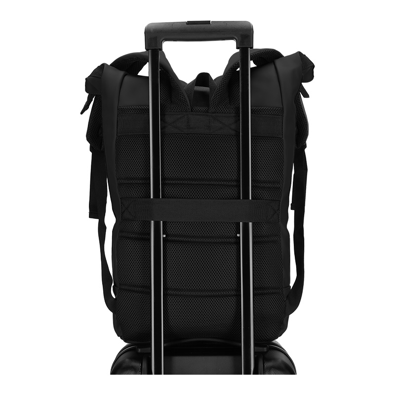 De Dull PU rol rugtas is de perfecte tas om mee te nemen als je op pad gaat. De tas is te herkennen aan het matte vegan leer waarvan de tas gemaakt is. De binnenvoering van gerecyclede PET flessen maakt deze tas extra duurzaam. Door de gecoate ritssluitingen en het waterafstotende materiaal is de tas geschikt voor ieder weertype. De bovenzijde van de tas is op te rollen en middels een gesp af te sluiten. Aan de voorzijde van de tas zit een afsluitbaar opbergvak en met de verstelbare schouderbanden pas je de tas eenvoudig aan naar het gewenste draagcomfort. De rugzijde is voorzien van een foam voering. Daarnaast zit hier ook een zogenaamde trolleyband, waarmee je de tas bijvoorbeeld over een trolleystang zou kunnen schuiven. Tot slot beschikt de tas over een laptop divider aan de binnenzijde en een extra afsluitbaar binnenvakje voor kleine accessoires.