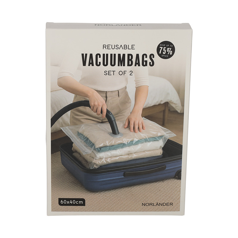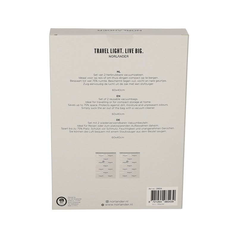Deze set van twee herbruikbare vacuüm opbergzakken is ideaal voor op reis of om thuis kleding of beddengoed op te bergen. Je bespaart tot wel 75% ruimte! De zakken beschermen daarnaast ook tegen vuil, vocht en nare geurtjes.Zuig eenvoudig de lucht uit de zakken met een stofzuiger of met de NORLÄNDER Oplaadbare Vacuüm & Lucht Pomp.