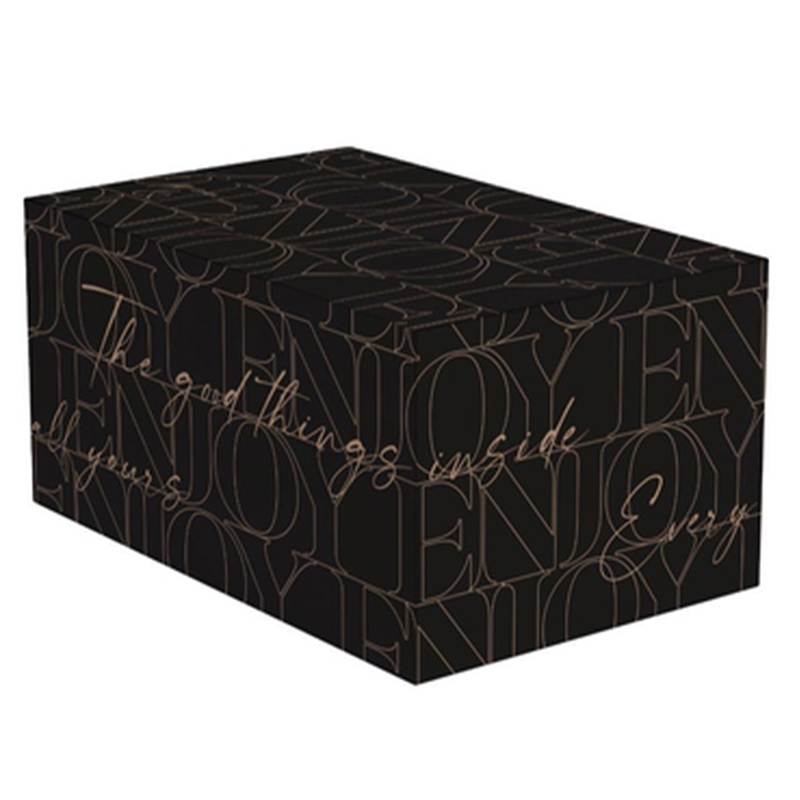 Deze elegante zwarte geschenkdoos met de boodschap “Enjoy the good things inside” straalt luxe en aandacht uit. Het subtiele patroon met het woord “ENJOY” in goud gecombineerd met sierlijke handgeschreven letters maakt van deze doos een stijlvol statement.