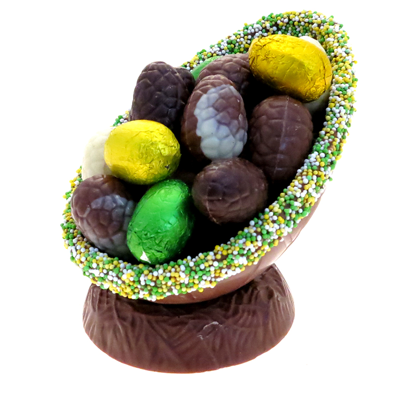 Een paasei gemaakt van Callebaut chocolade; hoogwaardige chocolade gemaakt van 100% duurzaam geteelde cacaobonen. Dit luxe chocolade paasei is versierd met musket en gevuld met overheerlijke paaseitjes.