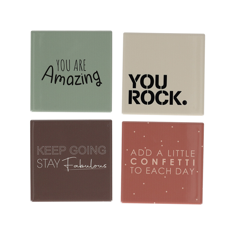 Deze complimenten tegels geven elk interieur een positieve en persoonlijke touch. De stevige tegels zijn bedrukt met complimenten en kunnen worden neergezet in de beukenhouten standaard of gebruikt worden als onderzetter voor koffie, thee of andere drankjes. Perfect als cadeautje of om zelf van te genieten.