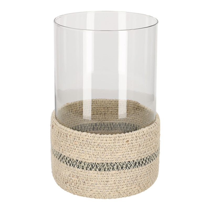 Deze lantaarn van glas en natuurlijk zeegras brengt direct warmte en sfeer in huis. Het geweven zeegras geeft de lantaarn een rustieke en moderne uitstraling. Plaats een kaars in het glas en het licht schijnt sfeervol door de vezels heen.