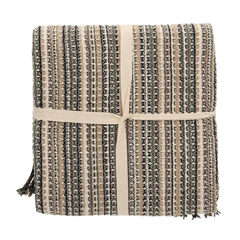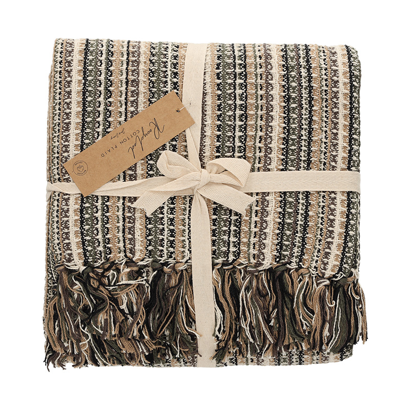 Dit plaid is gemaakt van gerecycled katoen en heeft daardoor een duurzaam karakter. Met het patroon en de trendy kwastjes is dit plaid een leuke verschijning in je interieur. Leg het plaid uitgevouwen op de bank of op het bed of gebruik dit kleed om heerlijk onder te kruipen tijdens de koude winterdagen.