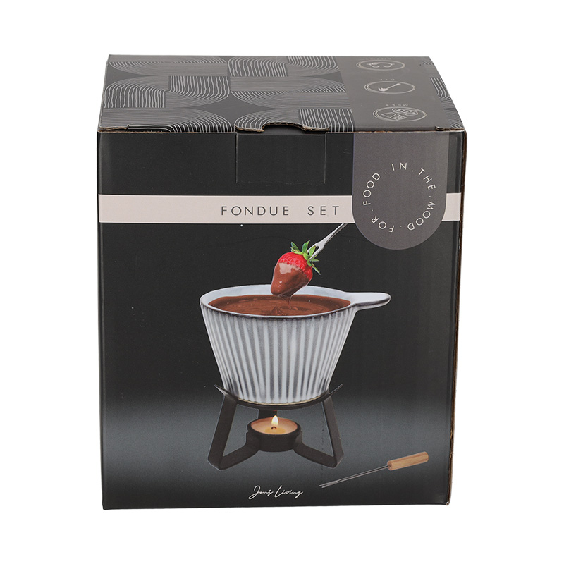 Deze fondue set is perfect voor een knusse avond vol lekkernijen. De pan met ribbelstructuur geeft de set een stijlvolle uitstraling. Met de twee fonduevorkjes met houten handgreep geniet je eenvoudig samen van gesmolten kaas of chocolade. Het metalen onderstel heeft ruimte voor één theelichtje, zodat je fondue gelijkmatig warm blijft. Een gezellige en smaakvolle toevoeging aan elke tafel.