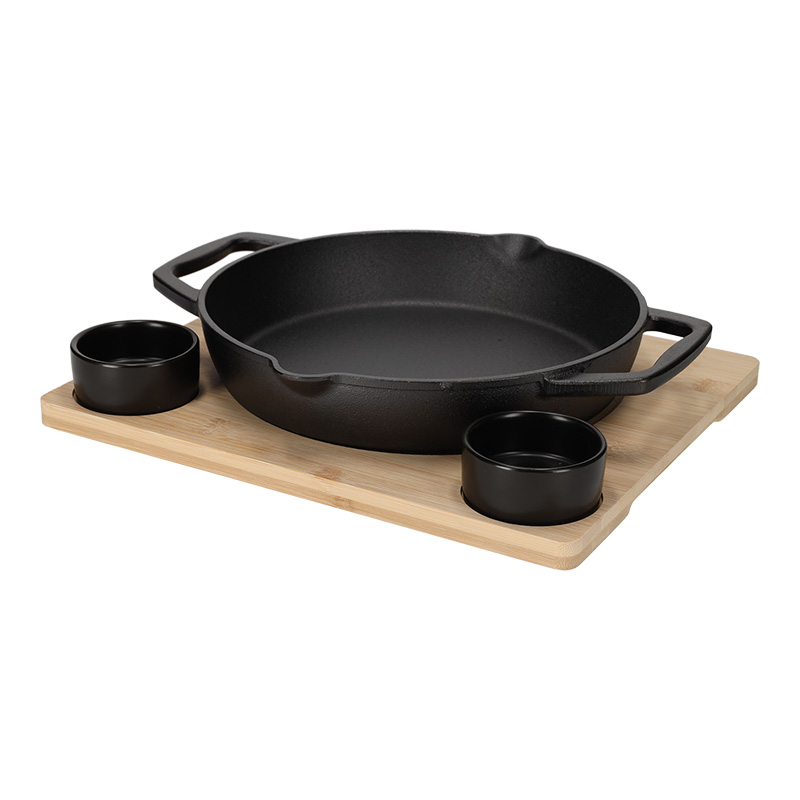 Presenteer je gerechten of hapjes op een bijzondere manier met deze stijlvolle serveerset. De set bestaat uit een bamboe serveerplank, twee keramische schaaltjes en een gietijzeren pan. De gietijzeren pan zorgt voor een gelijkmatige hitteverdeling, perfect voor searen, sauteren, warmhouden, bakken en koken. De pan is geschikt voor de volgende hittebronnen: gas, oven en barbecue.