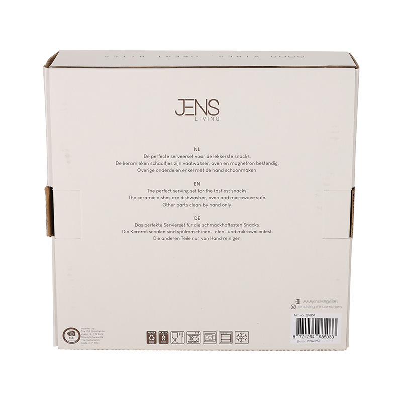 Deze tapas set is ideaal voor het stijlvol presenteren van borrelhapjes en dips. De set bestaat uit vier keramieken schaaltjes met een speels patroon. De schaaltjes staan op een stevige acaciahouten tray met een metalen handgreep, waardoor je de set gemakkelijk optilt en presenteert. Een elegante en praktische toevoeging aan elke borreltafel.