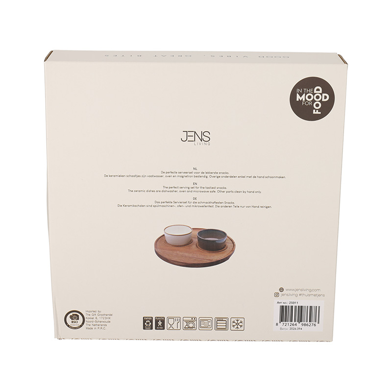 Deze serveerset is perfect voor dips, kleine hapjes of toppings. De twee keramieken schaaltjes zorgen voor een mooie en gevarieerde presentatie op tafel. De ronde acaciahouten plank heeft een subtiele inkeping waar de schaaltjes precies in passen, zodat ze stevig op hun plek blijven staan tijdens het serveren.