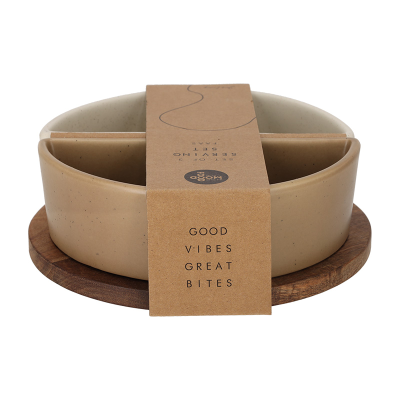 Deze serveerset bestaat uit een acaciahouten serveerplank met twee half ronde, keramieken schaaltjes. Perfect voor het serveren van snacks, dips of tapas. Dankzij de handige inkepingen blijven de schaaltjes stevig op hun plek en verschuiven ze niet bij het optillen van de plank. De schaaltjes zijn vaatwasser bestendig.