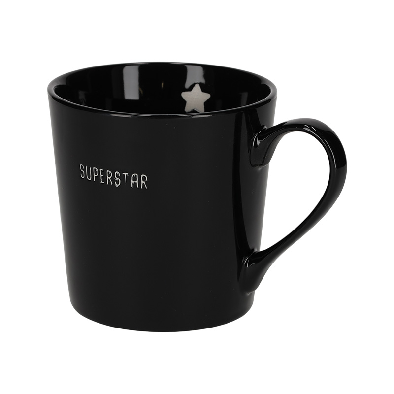Deze keramieken mok met oor heeft een glanzende afwerking en een inhoud van 370 ml. Op de voorzijde staat de quote: 'Superstar'. De binnenkant bevat een gegraveerd icoon. De perfecte mok om ieder koffie of theemoment een persoonlijke touch te geven!