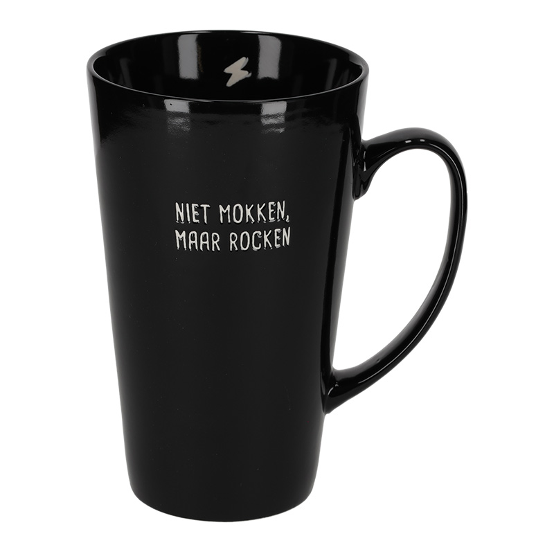 Deze keramieken mok met oor heeft een glanzende afwerking en een extra grote inhoud van 550 ml. Op de voorzijde staat de quote: 'Niet mokken, maar rocken'. De binnenkant bevat een gegraveerd icoon. De perfecte mok om ieder koffie of theemoment een persoonlijke touch te geven!
