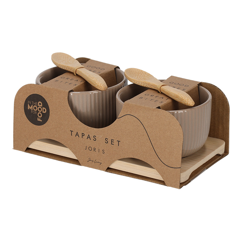 Deze tapas set is ideaal voor een gezellige borrel. De set bestaat uit twee schaaltjes die perfect zijn voor dips of kleine hapjes. Ze staan op een bamboe serveerplank, wat zorgt voor een warme en natuurlijke uitstraling. Met de bijpassende lepeltjes serveer je alles netjes en stijlvol. Een compacte en charmante set die elke borrel net wat leuker maakt.