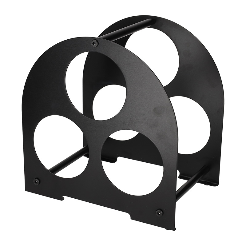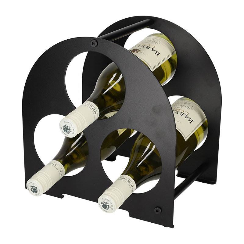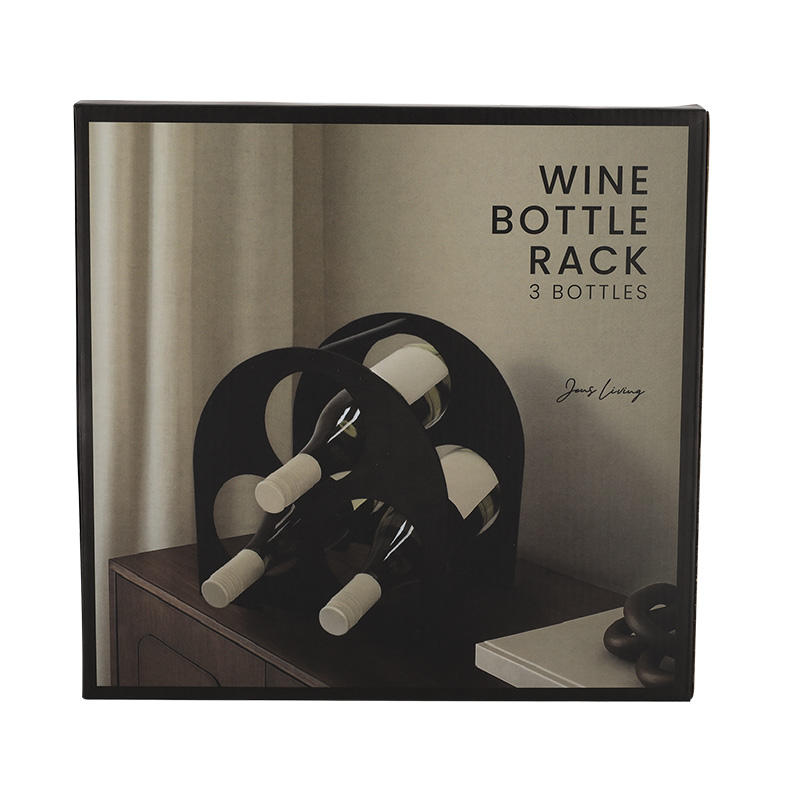 Dit wijnrek biedt een stijlvolle manier om drie flessen wijn compact op te bergen. Het rek is volledig gemaakt van metaal, wat zorgt voor een stevige constructie en een moderne look, geschikt voor ieder interieur. Perfect voor op het aanrecht, in een kast of als decoratief accent in de woonkamer. Een praktische en smaakvolle accessoire voor de echte wijnliefhebber.