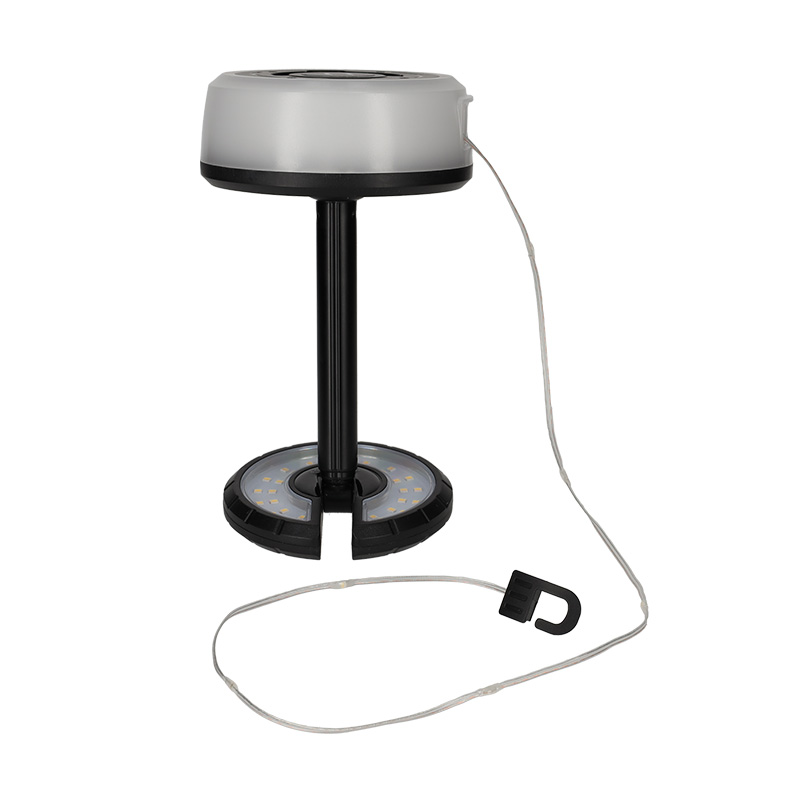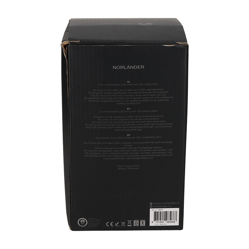 Deze LED lamp met slinger is een veelzijdige en sfeervolle lichtoplossing voor zowel binnen als buiten. Gebruik hem als staande lamp door de uitschuifbare poot omhoog te zetten of als lichtslinger met de LED-kabel van 8 meter. Met drie lichtmodules creëer je moeiteloos de juiste sfeer, of je nu kampeert, een tuinfeest houdt of extra licht nodig hebt op vakantie.