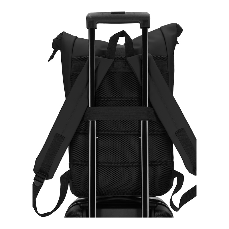 De Dull PU rol rugtas is de perfecte tas om mee te nemen als je op pad gaat. De tas is te herkennen aan het matte vegan leer waarvan de tas gemaakt is. De binnenvoering van gerecyclede PET flessen maakt deze tas extra duurzaam. Door de gecoate ritssluitingen en het waterafstotende materiaal is de tas geschikt voor ieder weertype. De bovenzijde van de tas is op te rollen en middels een gesp af te sluiten. Aan de voorzijde van de tas zit een afsluitbaar opbergvak en met de verstelbare schouderbanden pas je de tas eenvoudig aan naar het gewenste draagcomfort. De rugzijde is voorzien van een foam voering. Daarnaast zit hier ook een zogenaamde trolleyband, waarmee je de tas bijvoorbeeld over een trolleystang zou kunnen schuiven. Tot slot beschikt de tas over een laptop divider aan de binnenzijde en een extra afsluitbaar binnenvakje voor kleine accessoires.