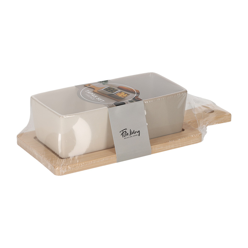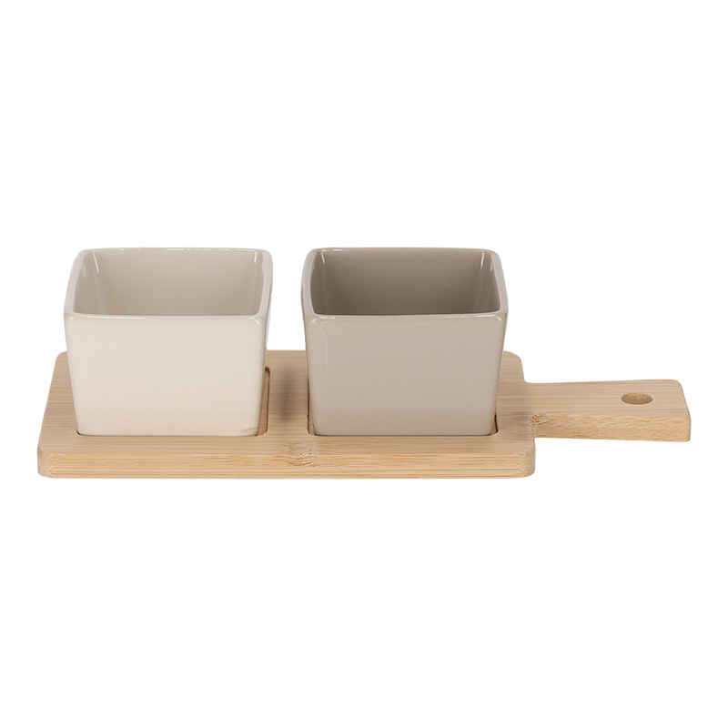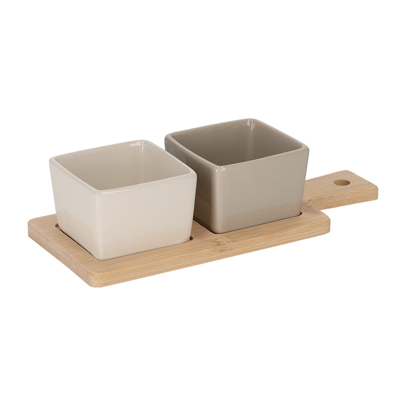 Deze tapas set is een elegante basis voor elke borrel of tapasavond. De set bestaat uit een bamboe serveerplank met twee vierkante keramieken schalen. Perfect voor dips, olijven, spreads of andere kleine snacks.