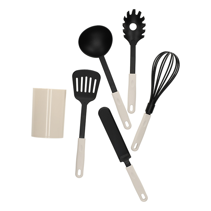 Breng stijl en gemak samen in de keuken met deze 6-delige keukengerei set. De set bestaat uit een soeplepel, een spaghetti lepel, een garde en twee soorten spatels. De houder houdt al het keukengerei netjes bij elkaar en binnen handbereik.